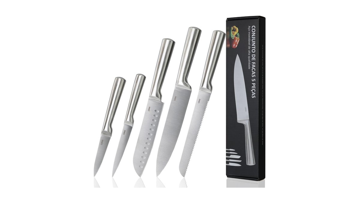 | Excelente custo-benefício (Preço acessível para 5 peças). | As facas são grandes, podendo ser pesadas para mãos muito pequenas. |